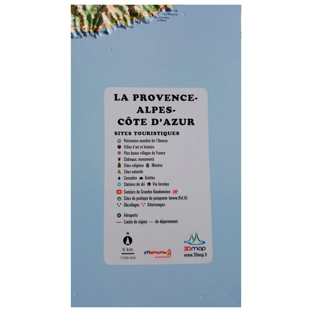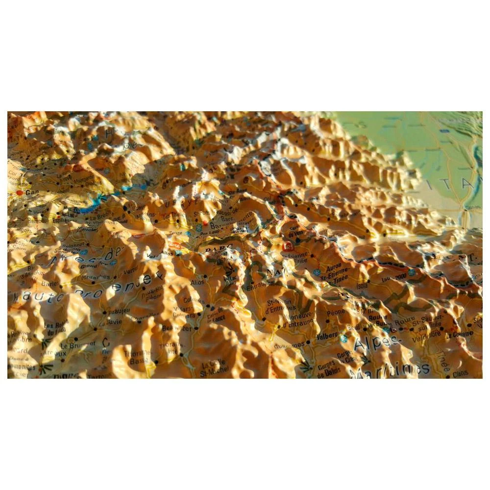 Les cartes 3DMAP sont fabriquées en France et apportent une nouvelle dimension à la cartographie, au sens propre comme figuré. Grâce à un logiciel de traitement 3D développé spécifiquement pour ces cartes, on obtient un niveau de finition tout à fait exceptionnel, rendant ces cartes aussi belles que détaillées. Sur ce modèle, c’est la belle région de Provence Alpes Cote d’Azur (PACA) qui montre ses secrets. Des villes d’art aux chateaux, des sites naturels aux stations de ski, vous passerez de la mer à la montagne en ayant l’impression d’y être.