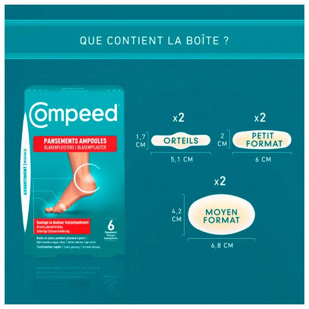 Le Compeed Pansement Ampoules Assortiment est une boite de pansements spĂ©cifiques aux ampoules de pied. Ils restent bien en place et aident Ă mieux cicatriser tout en soulageant la douleur et en rĂ©duisant les frottements. Cette boite intègre deux pansements moyen format, deux en petit format et deux pansements pour les ampoules aux orteils. Un must-have Ă bien garder dans la trousse de premiers soins.Â